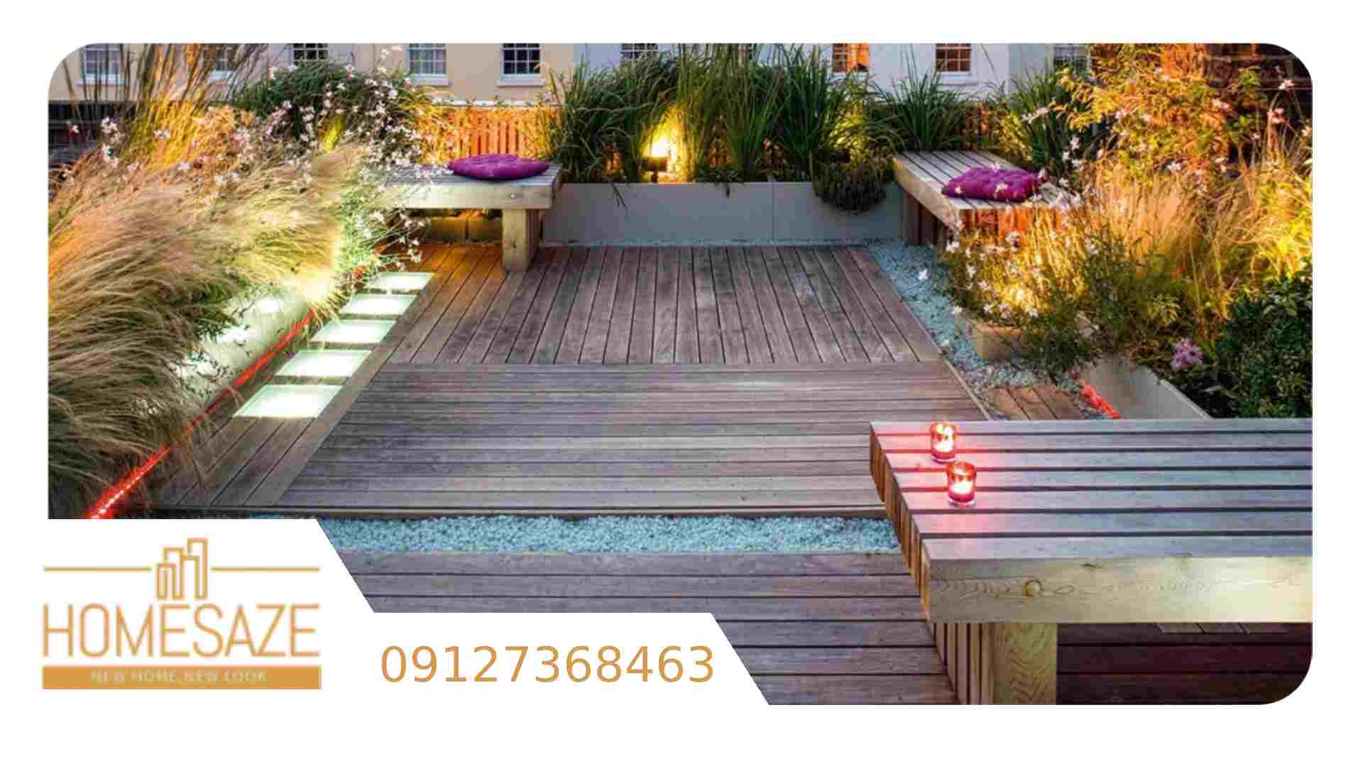 - نور مخفی: زیر نیمکتها، اطراف گلدانها یا داخل کفسازی میتوان نور مخفی نصب کرد تا در شب جلوهای چشمگیر ایجاد کند.