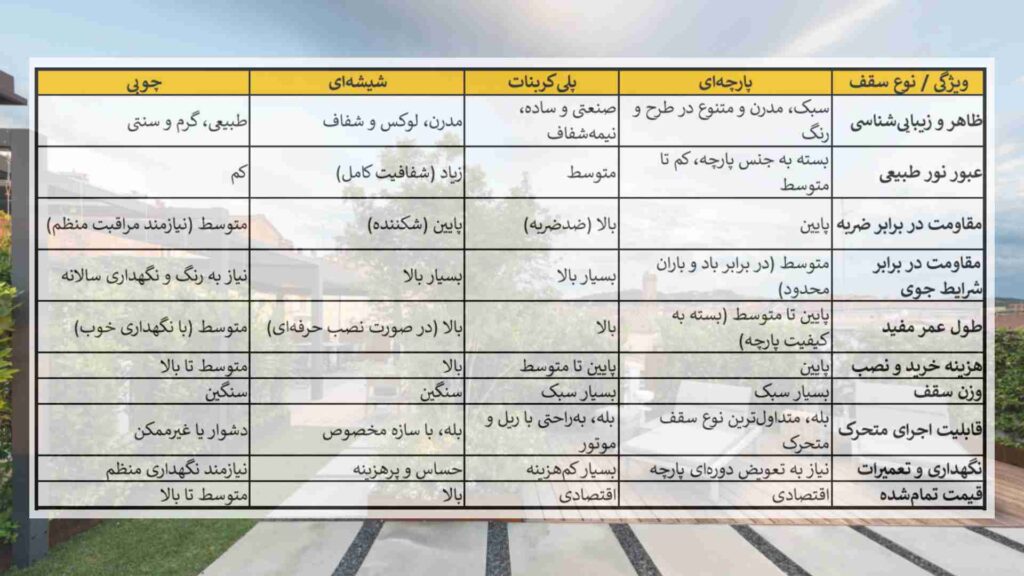اگر محدودیتی در بودجه ندارید و میخواهید بر نور و تهویه کنترل داشته باشید، سقف متحرک بهتر است. اما اگر نیاز به حداکثر حفاظت دارید و مراقبت و نگهداری کمتر را ترجیح میدهید، سقف ثابت.